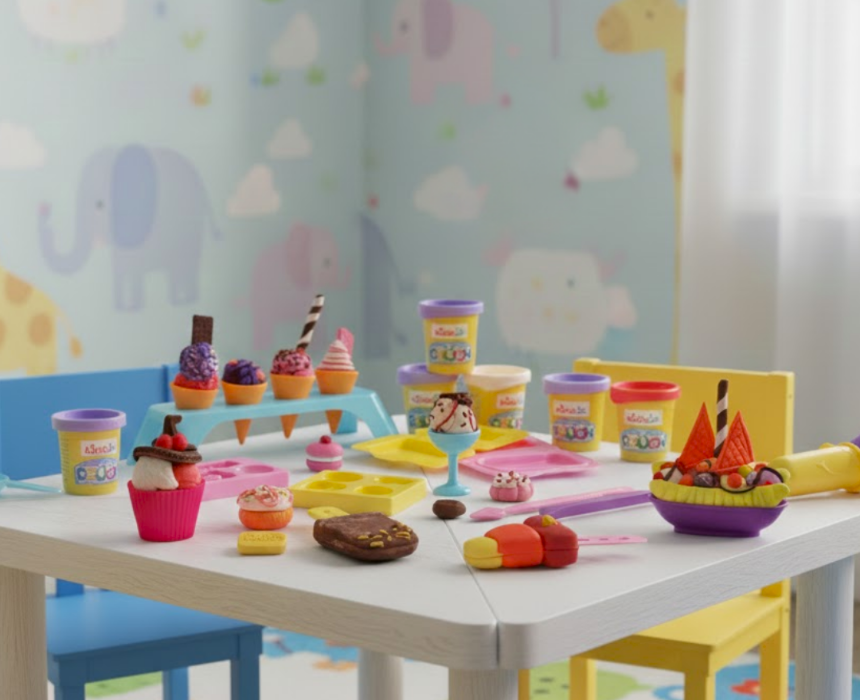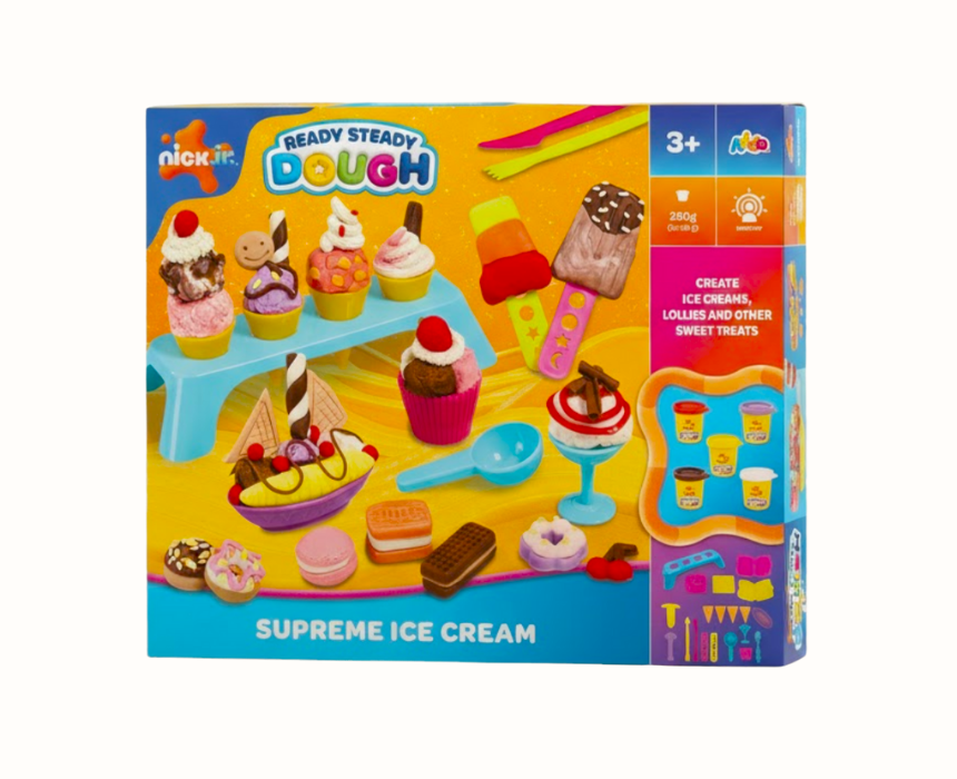 Designed for children aged 3 and up, the ADDO Nick Jr. Ready Steady Dough Supreme Ice Cream Playset includes 24 pieces and five pots of dough. Kids can use moulds, shapes, and accessories to create lollies, biscuits, desserts, and ice creams, adding sprinkles, sauces, or wafers. The set encourages creativity, sensory play, and color mixing, providing hours of imaginative fun.