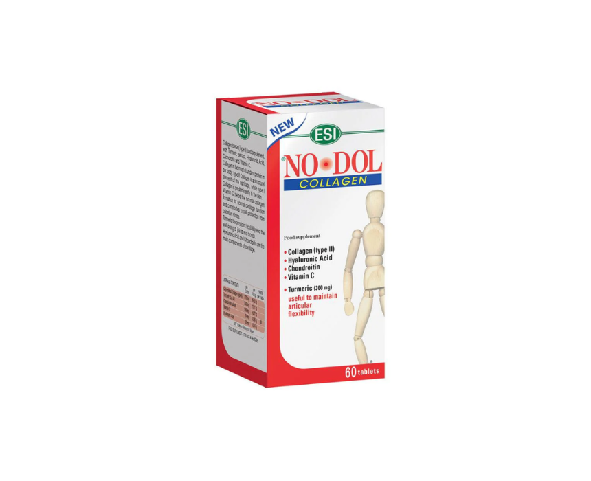 NoDol capsules are a natural food supplement formulated to support joint health and relieve pain associated with arthritis. They combine glucosamine, chondroitin, MSM, hydrolyzed collagen, turmeric, hyaluronic acid, and plant extracts like devil’s claw and aloe to aid connective tissue repair, reduce inflammation, and provide antioxidant protection. Manganese and vitamin C further contribute to bone structure and joint resilience. Recommended dosage is one tablet twice daily with meals and plenty of water.