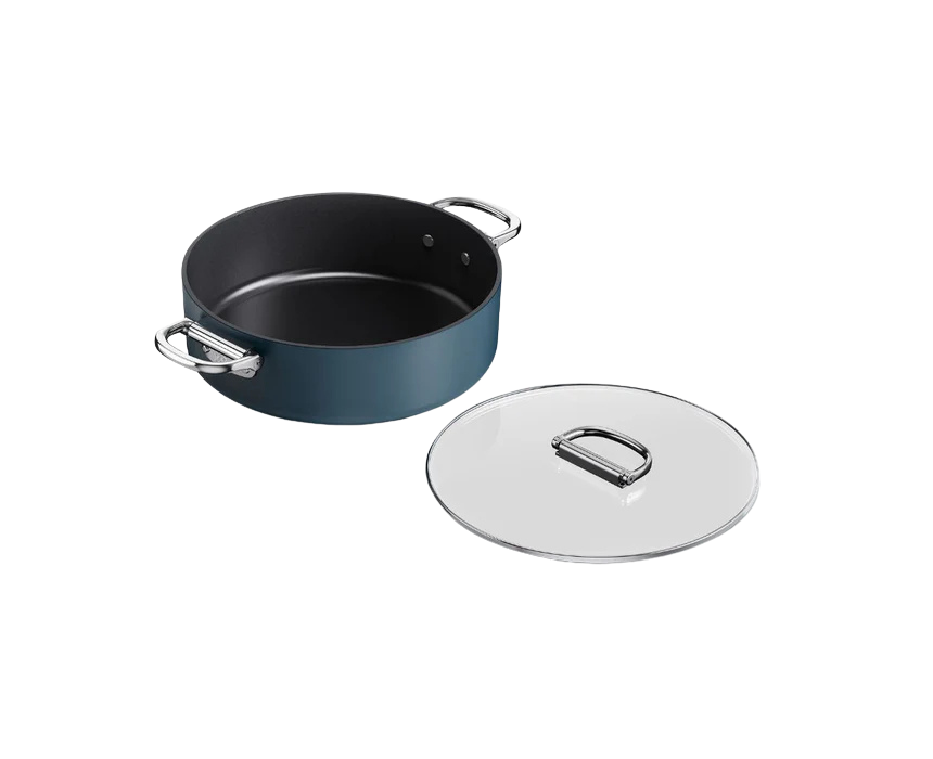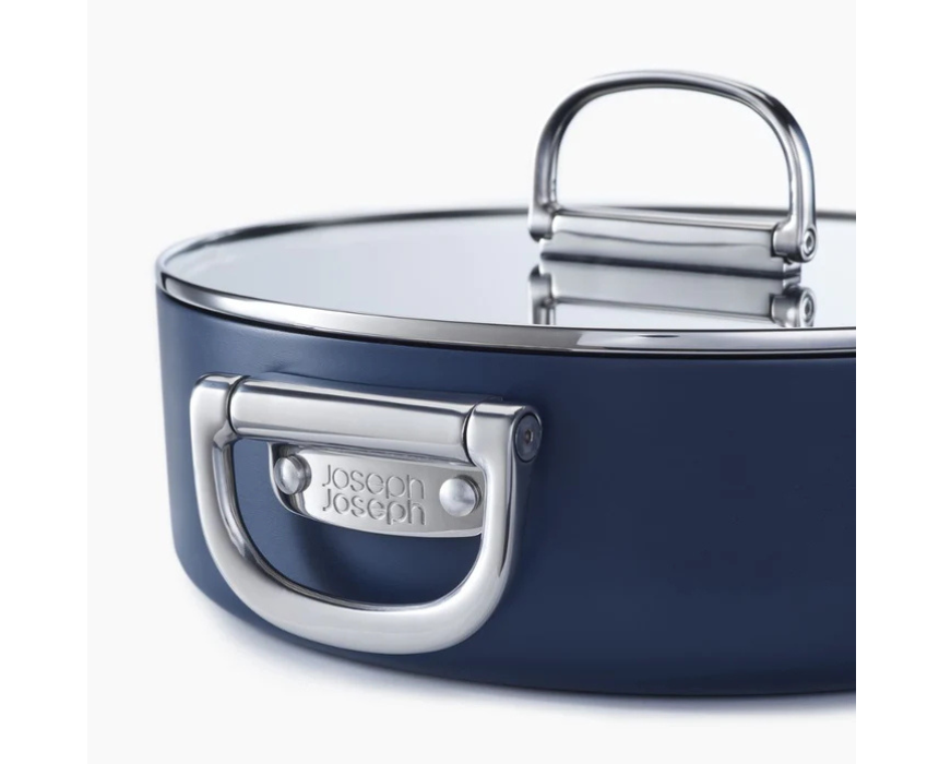 The Space 28cm shallow casserole in Midnight Blue combines professional quality with innovative design, featuring a heavy-gauge aluminium body and a non-toxic, non-stick ceramic coating free from PTFE, PFAS, PFOA, Lead, and Cadmium. Its folding stainless-steel handles save space, and the tempered glass lid with helper handle makes it ideal for one-pot meals, slow cooking, and braising. Suitable for all hobs including induction, it is oven safe up to 232ºC and dishwasher safe, though hand washing is recommended.