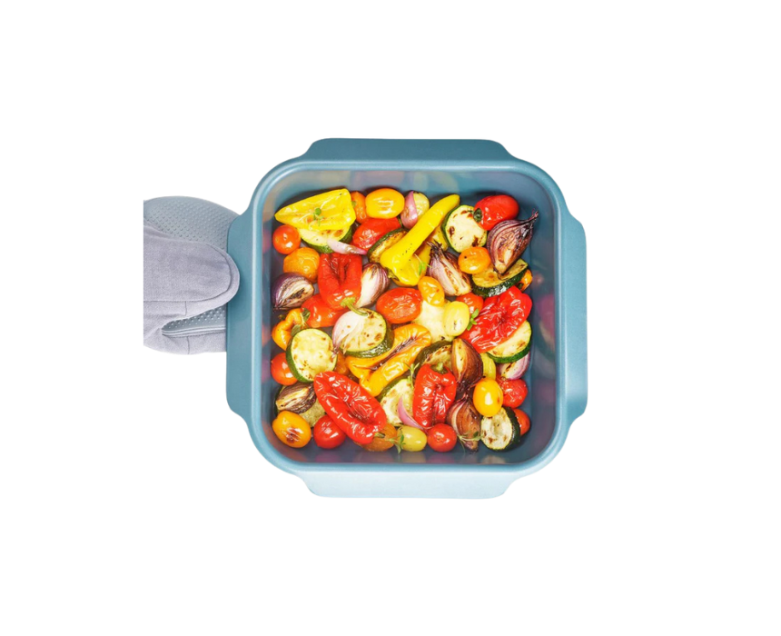 This heavy-gauge carbon steel Nest™ Oven tray features a durable non-stick coating and easy-pull side handles for safe use with oven gloves. Its space-saving nesting design allows airflow and prevents scratches when stored, making it ideal for compact kitchens. Suitable for temperatures up to 230°C, it is hand wash only and designed to work seamlessly with other Nest™ Oven products.
