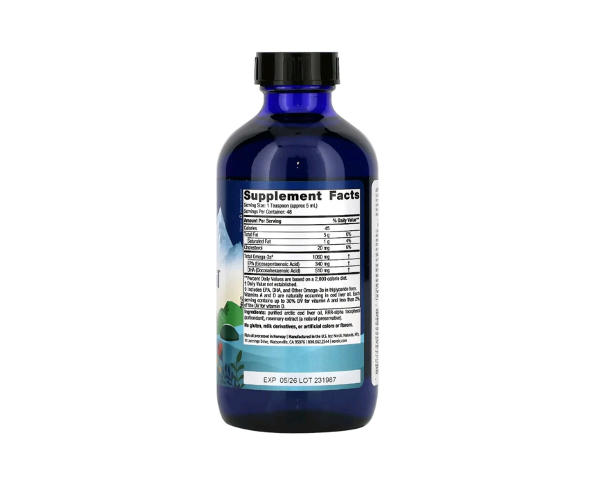 Nordic Naturals Arctic Cod Liver Oil 237 ml provides omega 3 from wild Arctic cod to support heart, brain, immune, and nervous system health with superior absorption and no fishy aftertaste. This non GMO tested and sustainably sourced formula delivers fresh triglyceride form fish oil and can be added to meals or taken on its own as a simple daily wellness step.