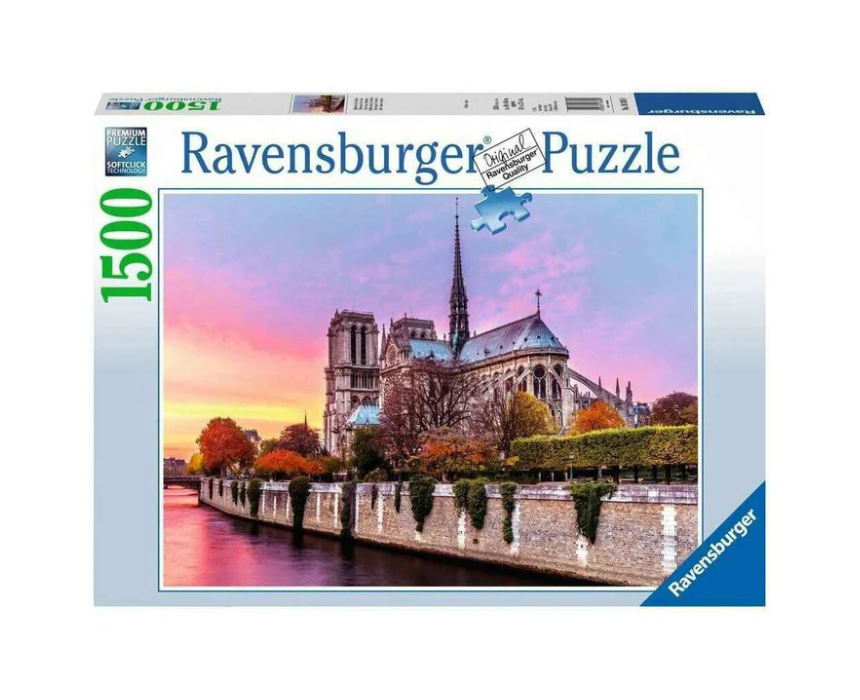 Experience the beauty of Notre Dame at sunset with this 1500-piece Ravensburger puzzle, designed for adults and children. Crafted from high-quality materials with a matte finish, each piece interlocks perfectly for a durable and vibrant puzzle experience. Ideal for extended entertainment, gifting, or relaxing solo play, this puzzle offers a challenging and rewarding activity with stunning artwork from global artists.