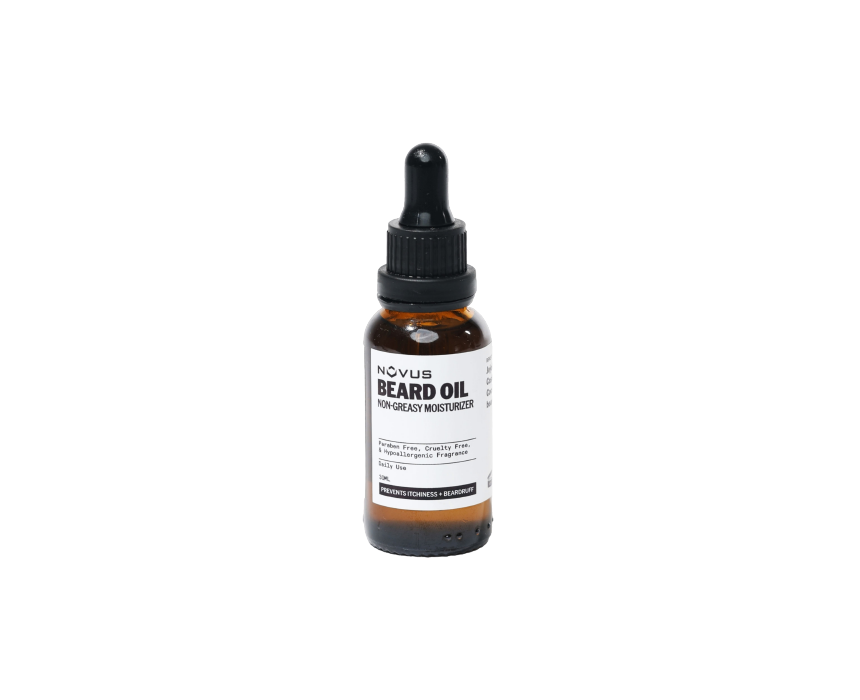 Novus Beard Oil is designed for the modern gentleman who wants to eliminate beard itch, dryness, and dandruff. Crafted with premium ingredients, this oil deeply moisturizes both the beard and the skin beneath, leaving it softer and healthier without any greasy residue. It reduces breakage, promotes fuller growth, and helps nourish follicles for a better beard. Apply 3-5 drops to a damp beard daily for optimal hydration and beard care. Proudly formulated in Lebanon.