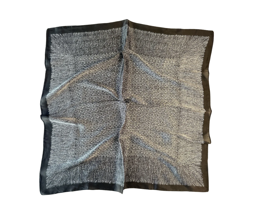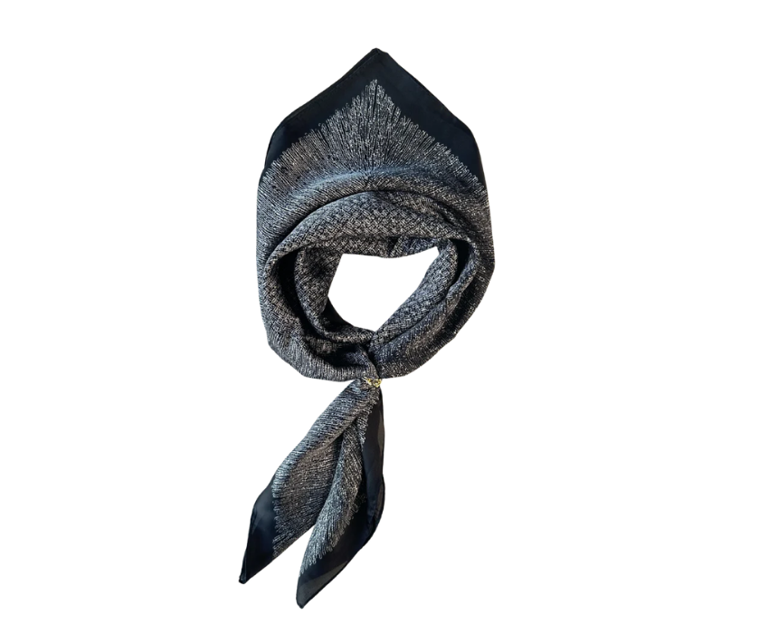 The Nuage d’Argent scarf features deep charcoal and soft silver tones on smooth synthetic satin, embodying understated elegance and modern refinement. Measuring 66 × 66 cm, it can be styled around the neck, as a headscarf, or tied to a handbag, pairing effortlessly with an all-black ensemble. Its sophisticated design adds a polished, contemporary accent to any outfit.