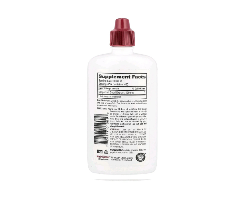 NutriBiotic Grapefruit Seed Extract Liquid Concentrate is a natural, unfiltered formula derived from the seed and pulp of grapefruit, used by healthcare professionals worldwide. This dietary supplement is not tested on animals and can be mixed into water or juice for adults and children over 5, supporting overall wellness. Follow the suggested dilution and take 1-3 times daily as directed by a healthcare professional.
