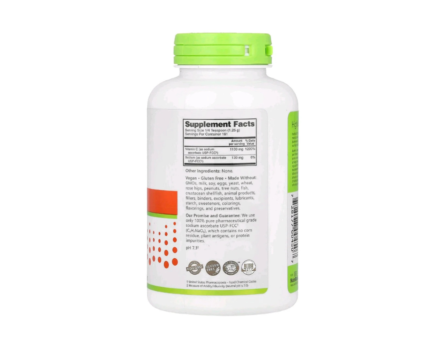 NutriBiotic Sodium Ascorbate is a 227 g pure crystalline powder providing 1100 mg vitamin C and 120 mg sodium per serving in a buffered non acidic form to support immunity antioxidant protection and collagen synthesis. Vegan gluten free and made with non GMO ingredients it is highly soluble and bacteria free for convenient mixing into water or juice. Users simply stir 1/4 teaspoon into a glass daily with or without meals.