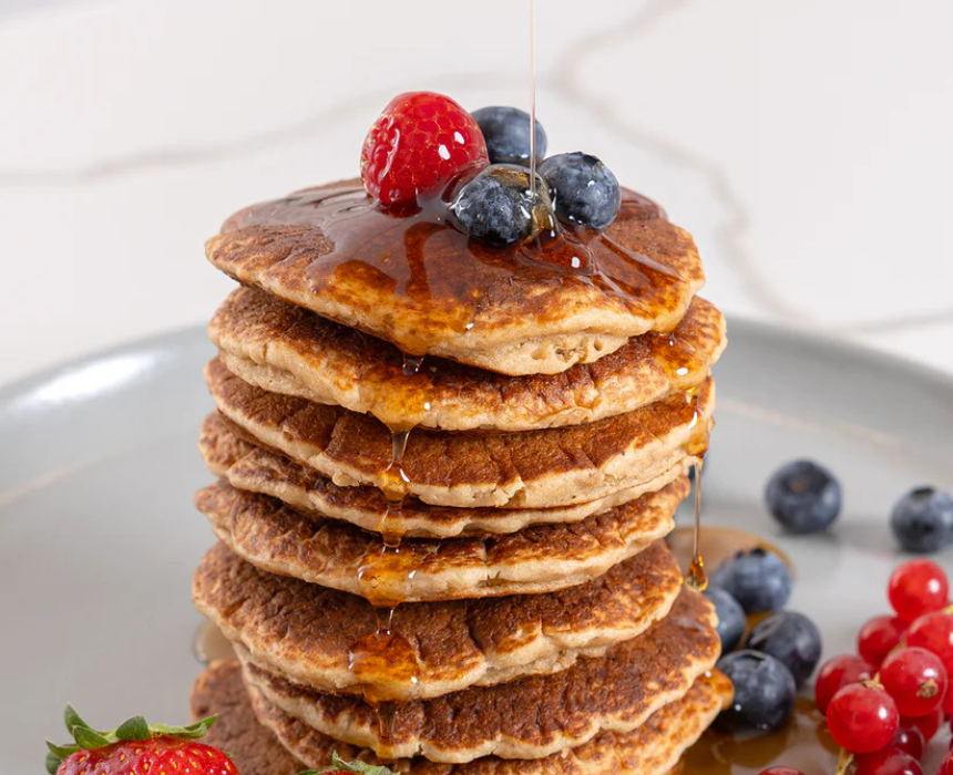 These oat and almond pancakes offer a soft fluffy texture and natural morning energy, made from oat flour, almond flour, dates, and aluminum free baking powder. Easy to prepare and perfect for busy mornings or slow weekend rituals, they pair well with maple syrup, fruit, peanut butter, or yogurt for added flavor and balance. Contains almonds and made in a facility that uses gluten and nuts.