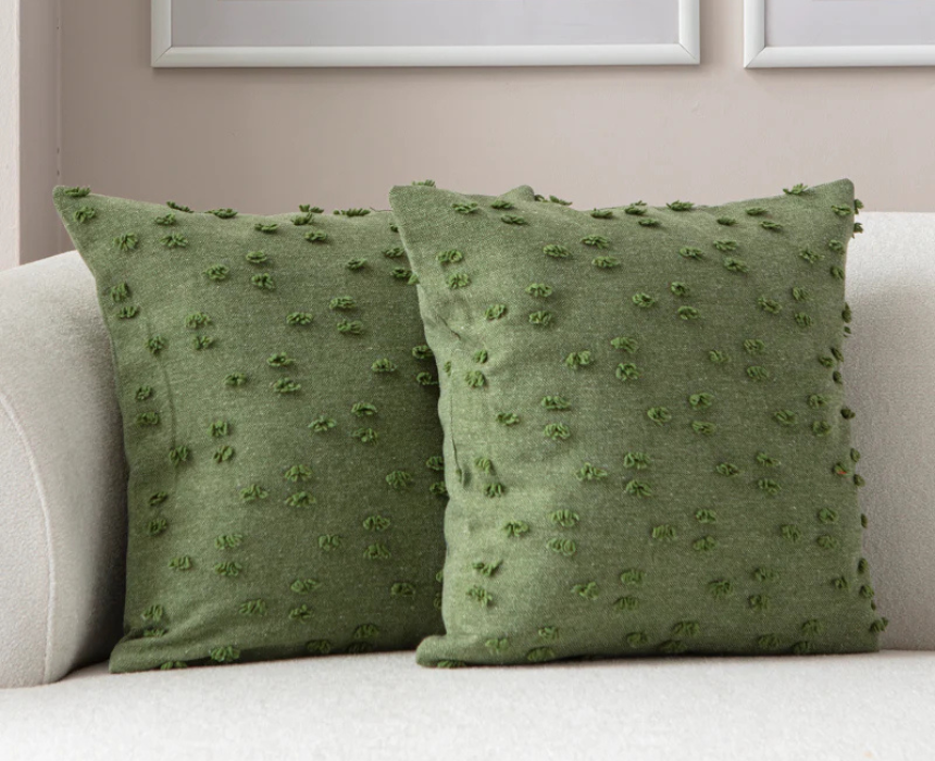 The Olive Green Textured Tufted Throw Pillow brings earthy warmth and soft dimension to any living room or bedroom with its rich olive tone and detailed tufted design. This decorative cushion cover easily refreshes a space and pairs beautifully with neutrals, botanicals, or layered patterns for a cozy, styled look.