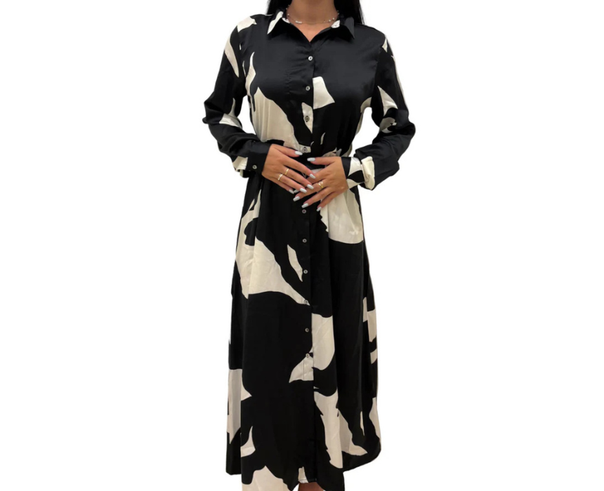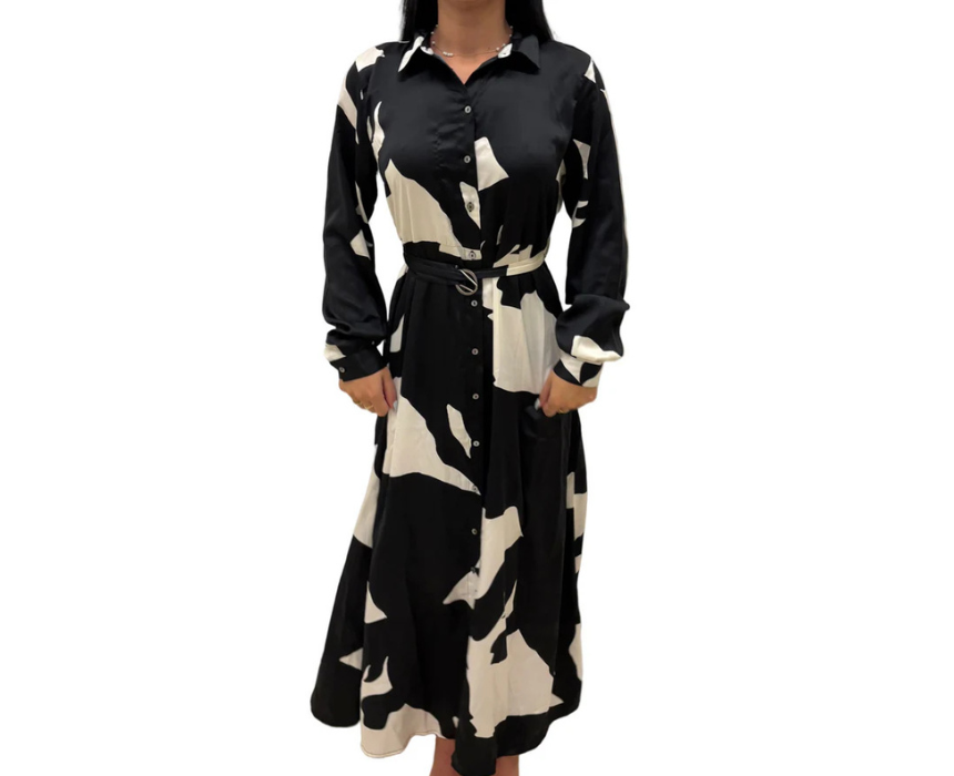 This long sleeve shirt dress features a black and white abstract print with a silky satin finish, a collared neckline, and an adjustable belted waist for a flattering silhouette. The button down front and flowy midi length create an elegant, versatile look ideal for evening outings, brunch, or dressy casual occasions. Made from 100 percent polyester, it combines comfort with sophisticated style.