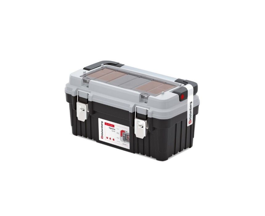 The Optima Toolbox BM by Kistenberg is a robust and functional storage solution featuring a long aluminum handle and a transparent polycarbonate lid. It includes a large lid organizer with space for long items (up to 320 mm), 7 removable boxes, and a tray for bits. Built from a durable polymer blend with galvanized metal latches, its lid can rest flat on the ground to double as a convenient work surface—ideal for organized, mobile, and professional tool use.