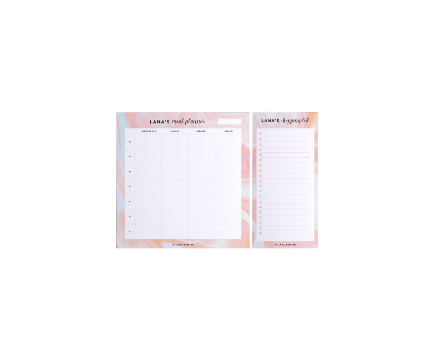 The Orange Marble Meal Desk Planner is an energetic two pad set featuring fifty three tear off sheets each to help you stay on top of your weekly meal prep and grocery lists. This vibrant stationery offers a modern stone aesthetic with high quality paper that allows you to cleanly remove completed sheets as you navigate your nutritional goals. To style this warm set, arrange the pads on a neutral kitchen counter for a bold pop of color or use a dark magnet to fix your daily ripped sheets to the refrigerator for a high contrast and easily accessible view of your cooking schedule.