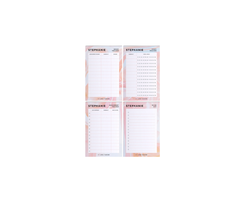 The Orange Marble Study Desk Planner is a vibrant organizational tool featuring four A6 note pads with fifty three tear off sheets each to keep your daily schedule focused. This energetic set offers a modern stone aesthetic with high quality paper that allows you to cleanly discard completed tasks and move forward with your academic goals. To style this warm stationery set, arrange the pads on a neutral desk for a bold pop of color or use a black magnetic clip to display your daily ripped sheets on a whiteboard for a striking and high contrast productivity layout.