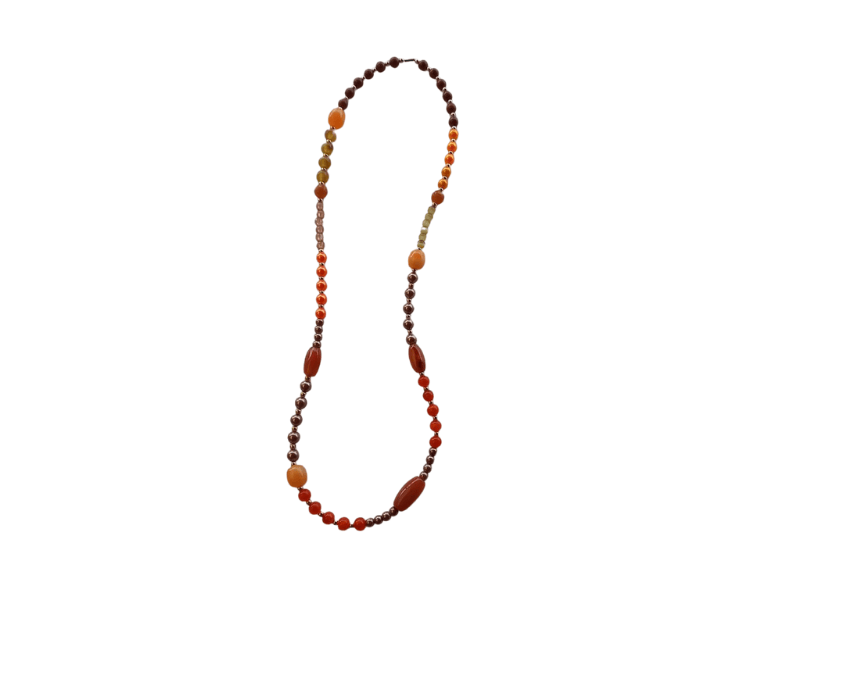 Medium necklace featuring a vibrant mix of brown and orange stones, orange pearls, bronze and beige small pearls, brown beads and crystals, accented with golden bulletins. Perfect for adding a warm, stylish touch to any outfit.