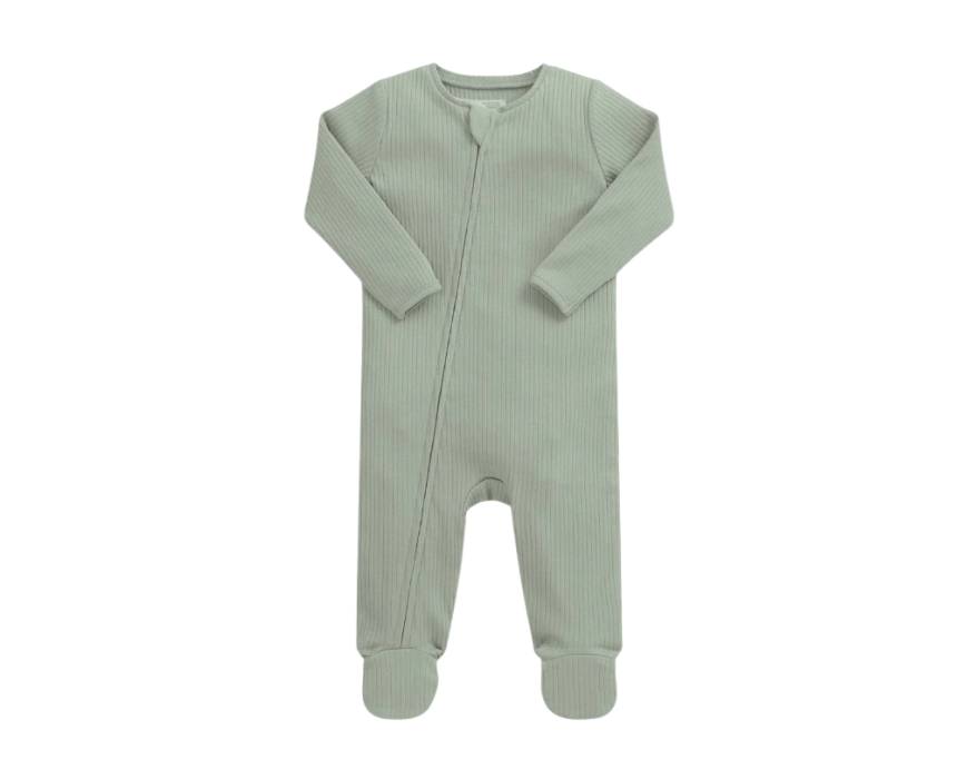 This Organic All In One Sleepsuit in sage green is crafted from 100% organic ribbed cotton, gentle on newborn skin and perfect for both boys and girls. Featuring a zip fastening for easy dressing, undressing, and nappy changes, it combines practicality with cosy comfort. The muted sage green shade offers a stylish, on-trend look, making it ideal for layering or wearing alone during sleep or play.