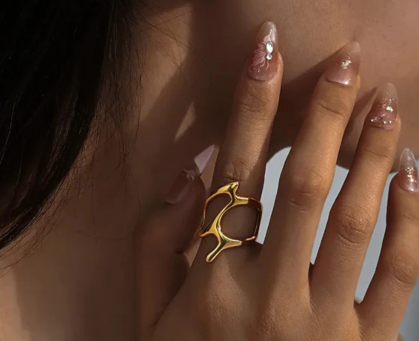 The Organic Lines Ring is crafted from durable stainless steel with an 18K gold plated finish, featuring fluid curved lines that create an artistic sculptural look inspired by natural movement. Water resistant and designed for comfortable everyday wear, it offers lasting shine with a bold yet elegant presence. Style it alone as a statement ring or pair it with minimalist bands to highlight its organic form.