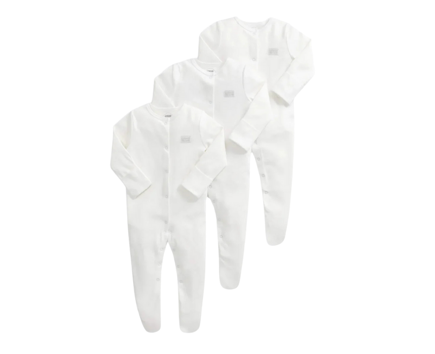 This 3-pack of organic sleepsuits in white is crafted from supersoft 100% organic cotton, gentle on newborn skin and perfect for both boys and girls. Each long-sleeved sleepsuit features popper fastenings for easy changes and a subtle Welcome to the World woven badge for a delicate finishing touch. Ideal for layering or wearing alone, these sleepsuits are a versatile and practical unisex wardrobe essential for day or night wear.