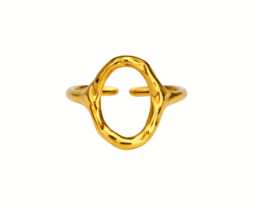 This oval asymmetrical adjustable ring features a modern and unique design that adapts comfortably to different finger sizes thanks to its flexible structure. Its distinctive shape adds a contemporary accent that enhances both casual and formal outfits with ease. Wear it as a standalone statement piece or combine it with other rings to create a stylish layered look suitable for everyday wear.