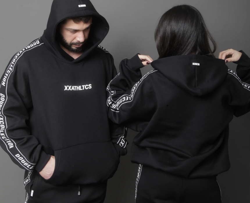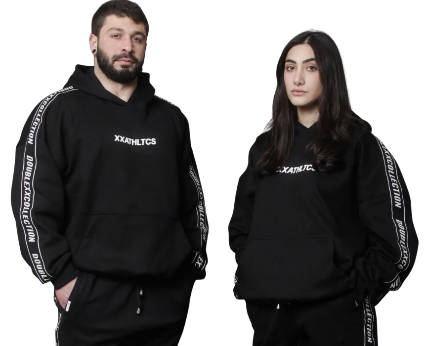 The XXATHLTCS oversized fit hoodie by doublexxcollection is a unisex cotton fleece design featuring a relaxed oversized cut, a high density XXATHLTCS print at mid chest, a small XXATHLTCS rubber label below the neck and on top of the hood, and elastic sleeves branded with doublexxcollection text from shoulder to wrist. Available in black, white, and light pink, it delivers premium comfort with an athletic streetwear edge. Style it with joggers, leggings, or jeans for a casual athleisure look.