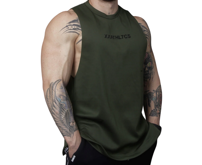 The XXATHLTCS oversized fit tank top by doublexxcollection is a unisex design crafted from premium heavy scuba material, featuring a relaxed oversized cut, a bold high-density XXATHLTCS print at mid chest, a small rubber label below the neck on the back, and two vertical parallel stripe stitches for added style. Available in army green, it combines comfort with a strong athletic streetwear look. Pair it with matching joggers, sweatpants, or layer under hoodies for a versatile athleisure outfit.