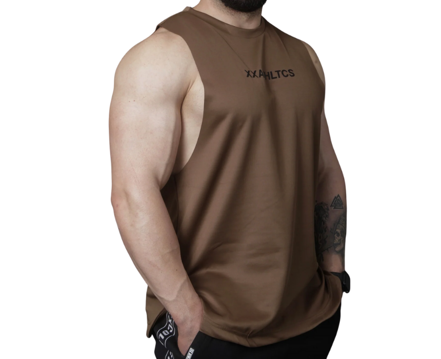 The XXATHLTCS oversized fit tank top by doublexxcollection is a unisex design crafted from premium heavy scuba material, featuring a relaxed oversized cut, a bold high-density XXATHLTCS print at mid chest, a small rubber label below the neck on the back, and two vertical parallel stripe stitches for added style. Available in brown, it combines comfort with a sleek athletic streetwear look. Pair it with neutral joggers, sweatpants, or layer under hoodies for a versatile athleisure outfit.