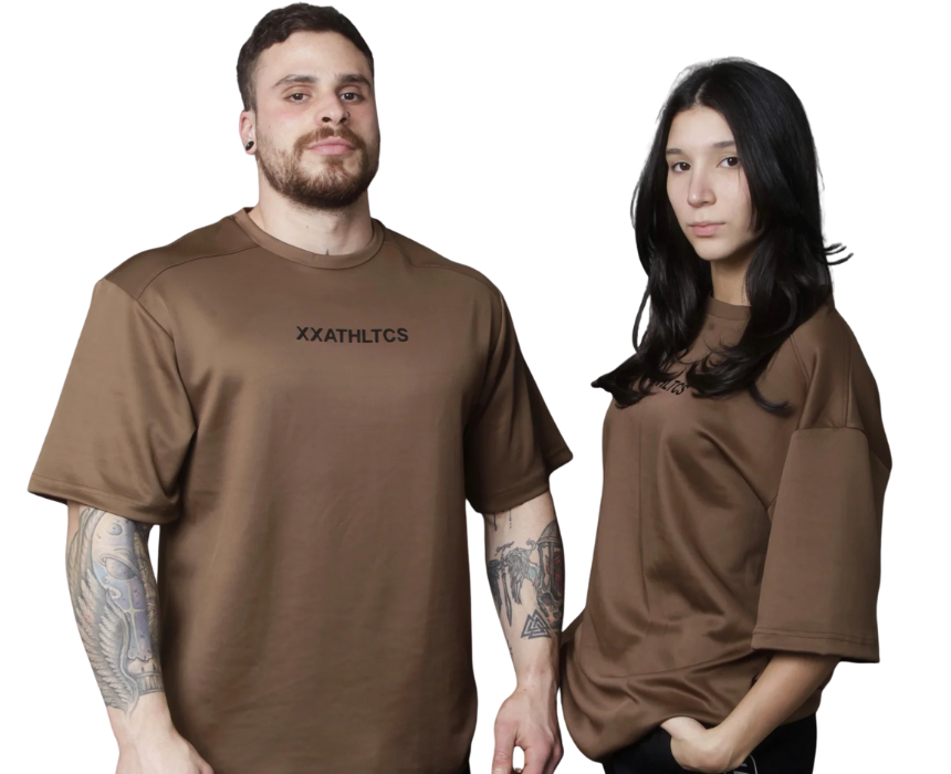 The XXATHLTCS oversized fit tee by doublexxcollection is a unisex design crafted from premium heavy scuba material, featuring a relaxed oversized cut, a high density XXATHLTCS print at mid chest, and a small XXATHLTCS rubber label placed below the neck on the back. Available in dark brown, it offers a warm, stylish take on athletic streetwear while maintaining comfort and structure. Pair it with neutral sweatpants, joggers, or denim for a versatile athleisure look.