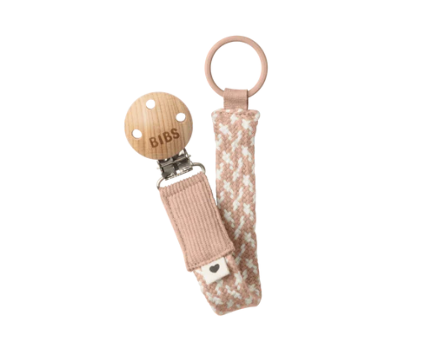 A safe and eco friendly pacifier clip crafted from GOTS certified cotton and FSC certified wood, designed to keep pacifiers secure and within reach. Measuring 22 cm, it features a nickel free metal clip that easily attaches to clothing and is suitable for pacifiers with or without a ring. Ideal for supervised daily use, it complements baby outfits while helping maintain cleanliness and convenience on the go.