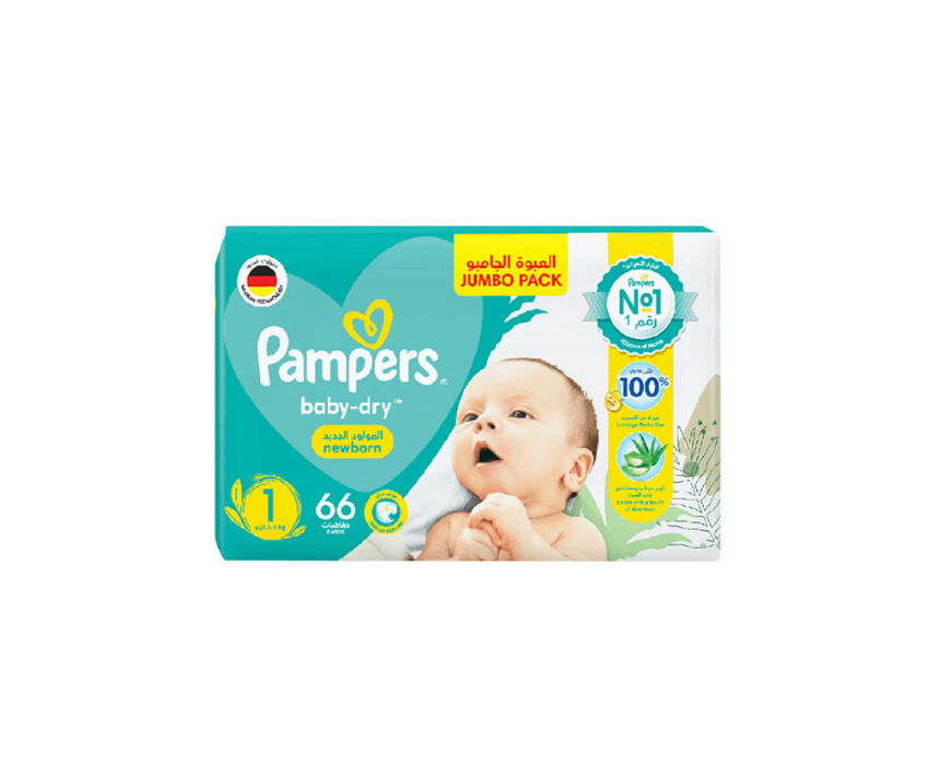 A pack of 66 Pampers newborn diapers offering long-lasting protection and gentle comfort for babies weighing 2–5 kg. Designed with soft, absorbent layers to keep newborns dry day and night, ensuring a secure and cozy fit.