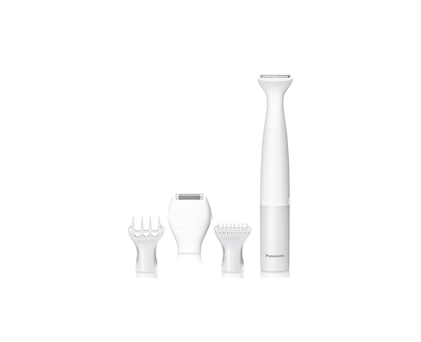 The Panasonic ES-WV62 bikini trimmer offers 2-in-1 trimming and shaving with gentle, rounded blades and hypoallergenic stainless-steel foils for safe grooming on sensitive skin. With four attachments, including a bikini comb and skin guard, it allows precise shaping wet or dry. Its compact, cordless design runs on a single AA battery, making it ideal for travel and everyday touch-ups.