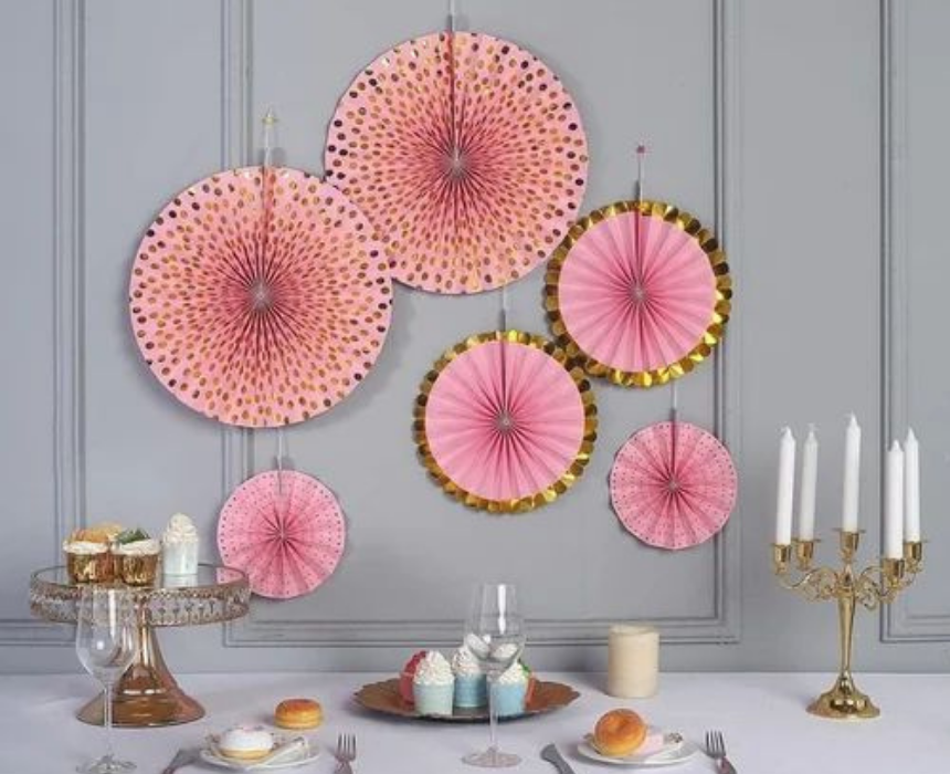The Pink & Gold Paper Fan set includes 6 decorative fans: 2 pieces (20 cm), 2 pieces (30 cm), and 2 pieces (40 cm). Perfect for birthdays, baby showers, and special celebrations, these elegant fans add a stylish and festive touch to any backdrop or party setup.