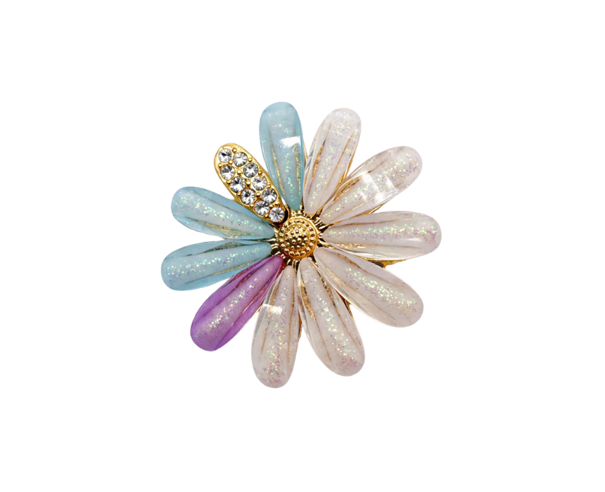 This pastel iridescent daisy brooch with crystal petals features a delicate and sparkling design with a secure pin backing for comfortable wear. Perfect for styling on jackets, blouses, scarves, or handbags, it adds a whimsical and elegant accent to both casual and formal outfits. Lightweight and versatile, it is ideal for personal accessorizing or as a thoughtful gift.