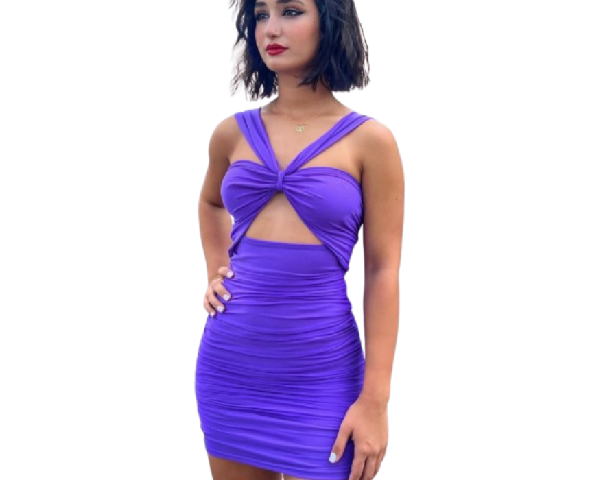 The Perla Dress features a fitted silhouette with ruched detailing and a bold front cutout accented by a twisted neckline design. Crafted to hug the body comfortably, it creates a flattering shape while adding a modern, statement touch. Style it with heels and minimal accessories for nights out or special occasions.