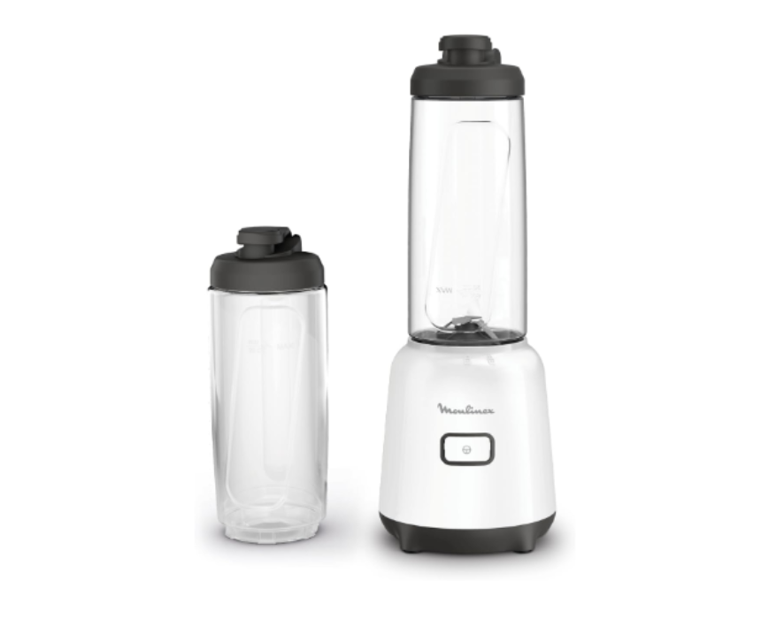 The Moulinex Mix & Move Mini Blender delivers 300W of blending power for smoothies, shakes, and protein drinks. Its compact design includes two 0.6L Tritan to-go bottles and removable blades for effortless cleaning. With ergonomic single-button control and portable bottles, it’s perfect for home use or on-the-go, ensuring smooth, creamy drinks anytime, anywhere.