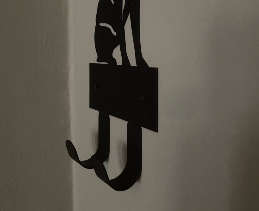 Personalized Pet Leash Hangers are made from durable 2 mm black steel with a powder-coated finish. Each set includes 2 hangers measuring 13.7 cm in width, gift-wrapped and ready to mount. Customization is available, and additional hangers can be added, contact the shop for more details.