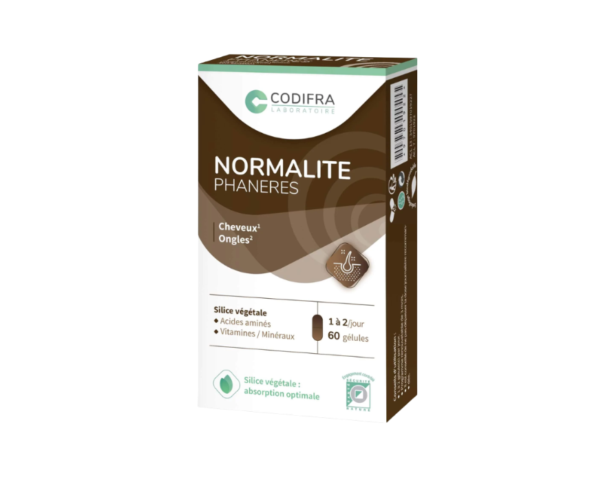 NORMALITE PHANERES is a food supplement formulated with biotin, selenium, zinc, amino acids, bamboo extract, and vitamins to support healthy hair and nails while protecting cells from oxidative stress. Designed for a 3-month program, it helps maintain strong, vibrant hair and nails when taken 1–2 capsules daily with water. Suitable for daily use as part of a wellness routine to enhance overall hair and nail health.