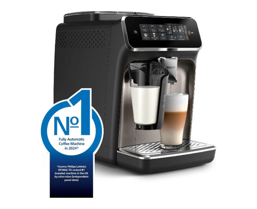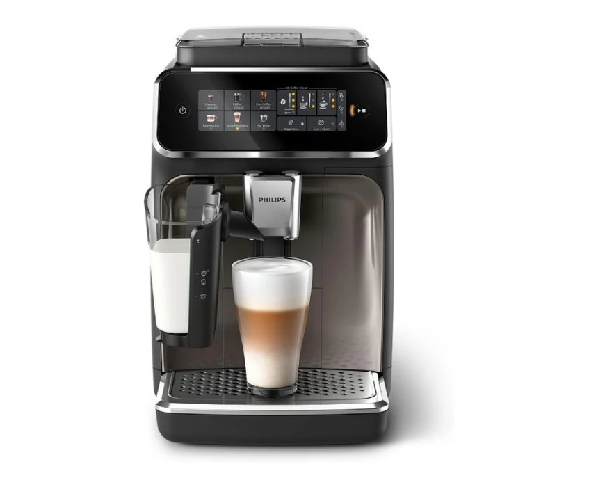 The Philips 3300 Series Espresso Machine with LatteGo in chrome offers six beverages and features SilentBrew technology for a quiet, rich coffee experience. Its intuitive interface and LatteGo milk system allow easy preparation of espresso, cappuccino, and latte macchiato. For best results, it is styled by filling the bean hopper and milk container, selecting the desired beverage, and enjoying café-quality drinks at home.