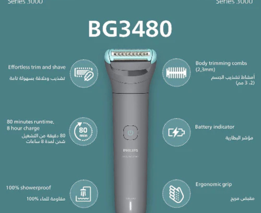 The Philips BG3480/15 Body Groomer Series 3000 is 100% showerproof and offers 80 minutes of cordless use, making it ideal for full-body grooming in and out of the shower. Its ergonomic design ensures comfortable handling while trimming and shaping hair with precision. For best results, it is styled by using gentle strokes on wet or dry skin for a smooth, even finish.
