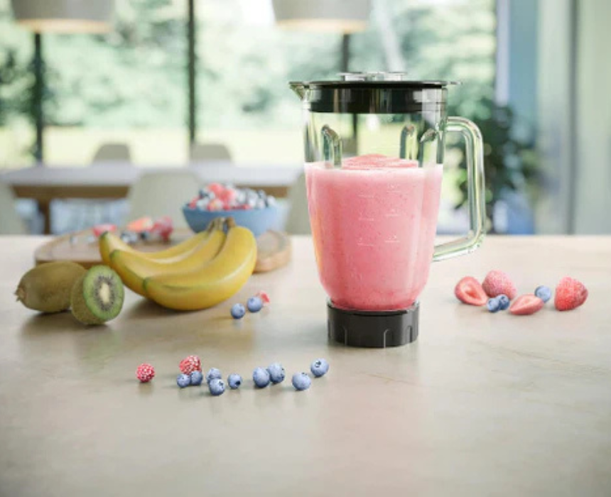 The Philips Blender 5000 Series delivers powerful 1200W performance with ProBlend Plus technology, a large 2L jar, and included chopper and mill attachments for versatile food preparation. Designed for smooth blending, grinding, and chopping, it handles smoothies, sauces, and spices with ease in a sleek black finish. Best styled on the kitchen countertop, it complements modern kitchens while staying ready for everyday use.