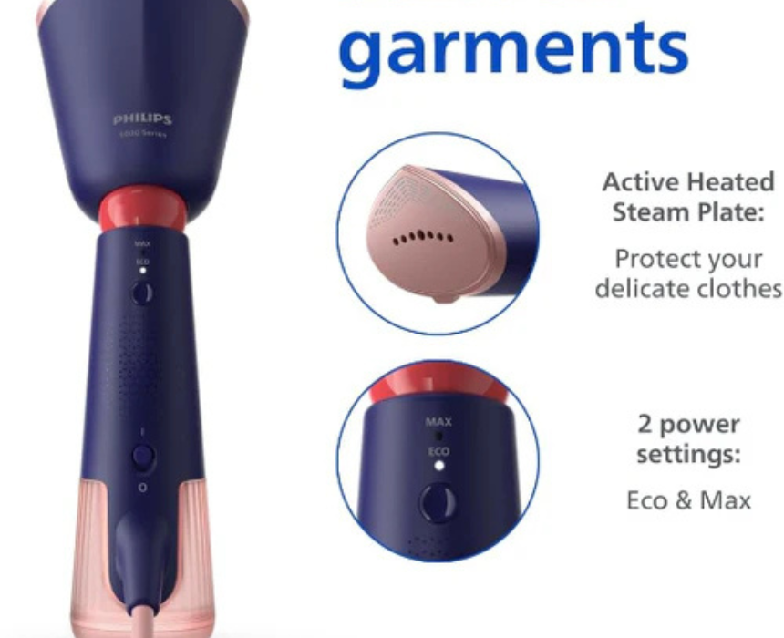 The Philips Handheld Steamer 7000 Series features a 1300W heating system with a foldable head for compact storage and easy travel, finished in a modern marine blue design. It delivers quick and effective steam to remove wrinkles from a variety of fabrics, making it ideal for home or on the go garment care. Best styled on a wardrobe shelf or packed in luggage, it suits both daily outfits and travel needs.