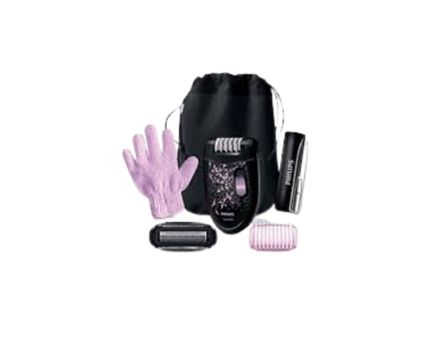 The Philips Satinelle Epilator HP6424 Limited Edition provides smooth, hair-free skin with ease. Its gentle tweezing discs remove hairs as short as 0.5mm without pulling, while the washable epilation head ensures hygiene. With two-speed settings and an ergonomic grip, it offers customized comfort for legs and body. This set includes a shaving head, trimming comb, exfoliation glove, portable tweezers with light & mirror, pouch, and cleaning brush for complete hair removal and skincare convenience.