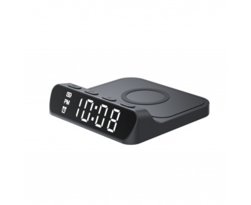 The W3031 phone wireless charger in black combines 15W magnetic fast charging with a built-in digital clock for convenience and style. Its sleek design keeps your desk or bedside organized while securely holding your phone in place, making it perfect for home or office use. Easy to use, it enhances both functionality and modern aesthetic in any space.