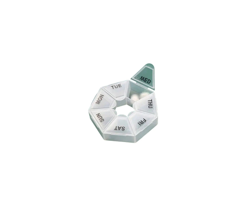 This round pill organizer features seven compartments, one for each day of the week, making it easy to track daily medications or supplements. Compact and convenient, it helps maintain a consistent dosing schedule.