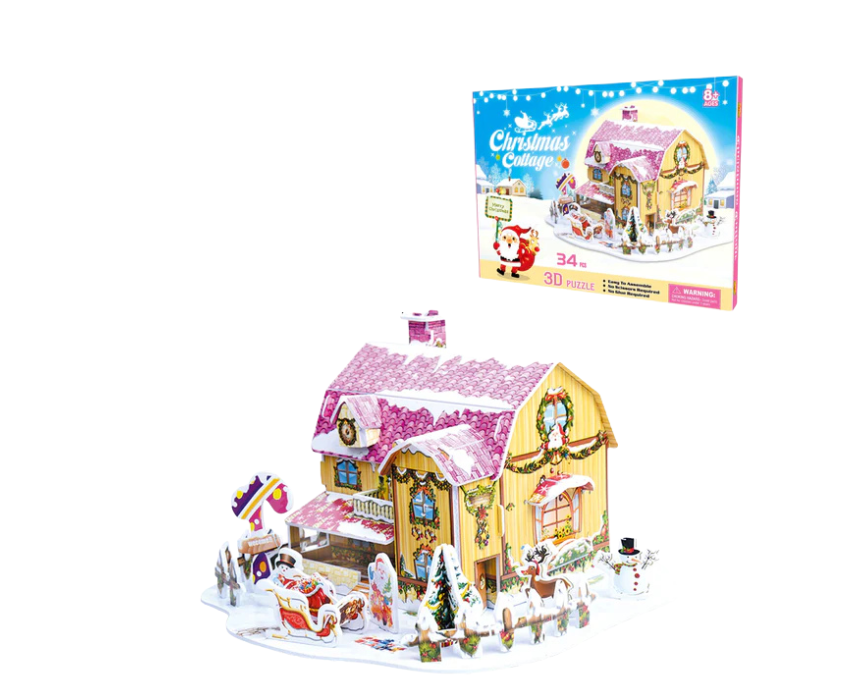 Pink Christmas Cottage 3D Puzzle is a charming buildable décor piece featuring a festive pastel cottage with layered details designed for easy assembly. It includes precision cut puzzle pieces that form a sturdy three dimensional display perfect for the holiday season. Style it on a mantel, shelf, or tabletop as a cute Christmas accent or seasonal centerpiece.