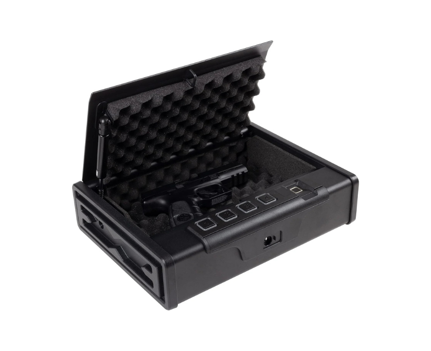 The KOLMAN gun safe securely stores up to two handguns with quick access via fingerprint sensor, keypad, or key, and includes two backup override keys. Constructed from heavy-duty 14-gauge carbon steel with anti-pry bars, reinforced hinges, and shock-resistant latches, it features an impact detection alarm for added security. Compact and versatile, it can be mounted on a desk or nightstand, keeping firearms safe from unauthorized access while remaining easily accessible.