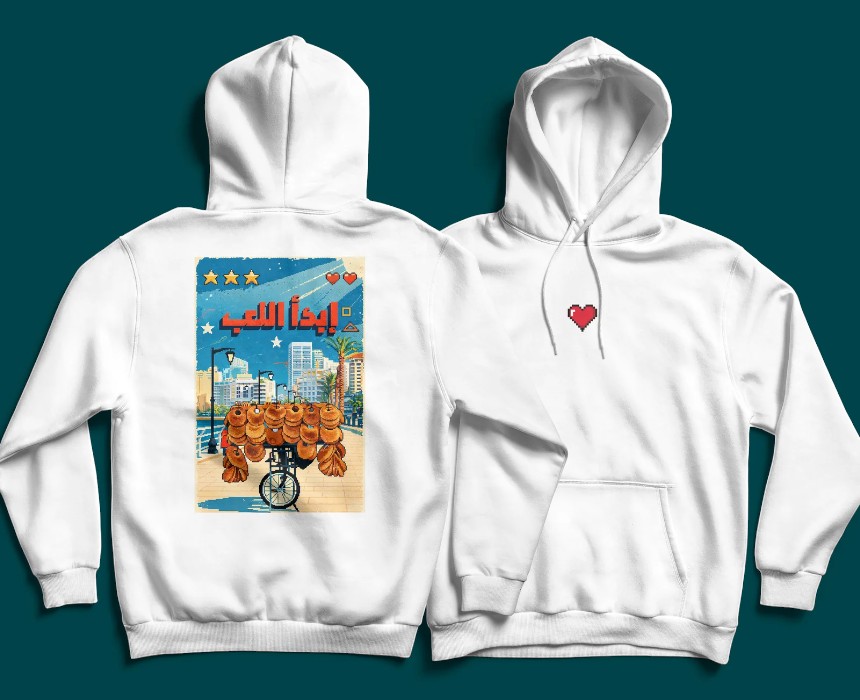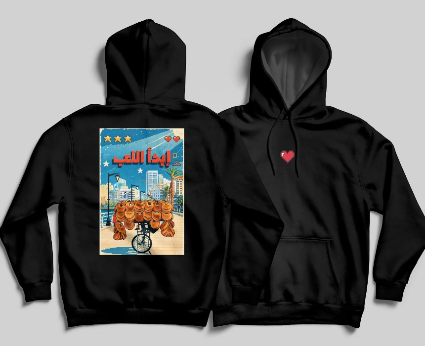 Start the game—Beirut style. The Pixel Beirut Hoodie blends retro gaming nostalgia with iconic Lebanese street life. Featuring a pixel-art cityscape, kaak vendor cart, and classic game UI elements, this premium heavyweight hoodie feels like your favorite childhood game. A subtle pixel heart on the front and a bold back print make a statement in a comfortable unisex fit. Perfect for gamers and Beirut lovers, it features a soft, cozy interior for everyday wear. Available in White and Black from S to 2XL.