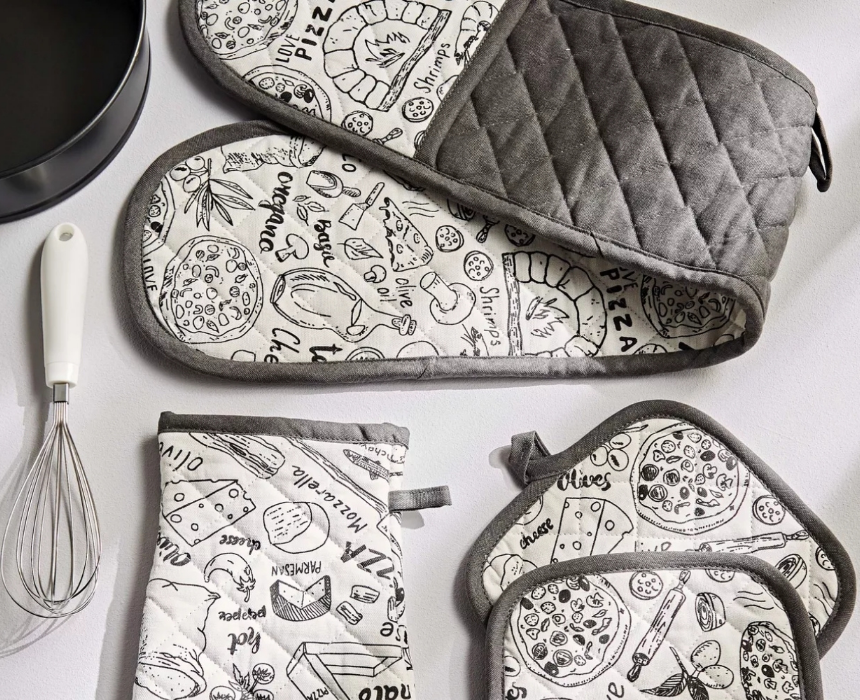 This double oven glove measures 33 x 18 cm and is an essential kitchen accessory for handling hot vessels safely. Made from durable cotton fabric, it protects your hands from heat and is machine washable for easy care. The fun pizza print adds a playful and attractive touch to your kitchen.