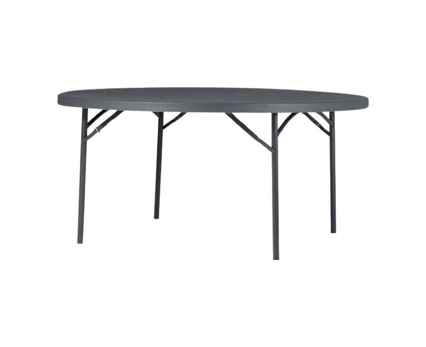 This round folding table measures Ø160 cm and comfortably seats up to eight people, making it perfect for banquets and celebrations. Constructed from high-density polyethylene with a spray-painted steel frame, it features an ergonomic design with no crossbars, integrated leg caps, and a gentle manual folding mechanism with safety lugs. Lightweight yet durable, it can be easily rolled for transport and supports up to 315 kg.