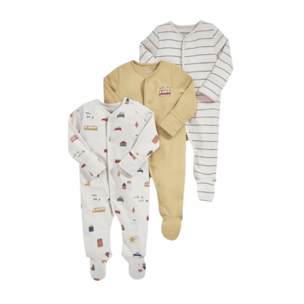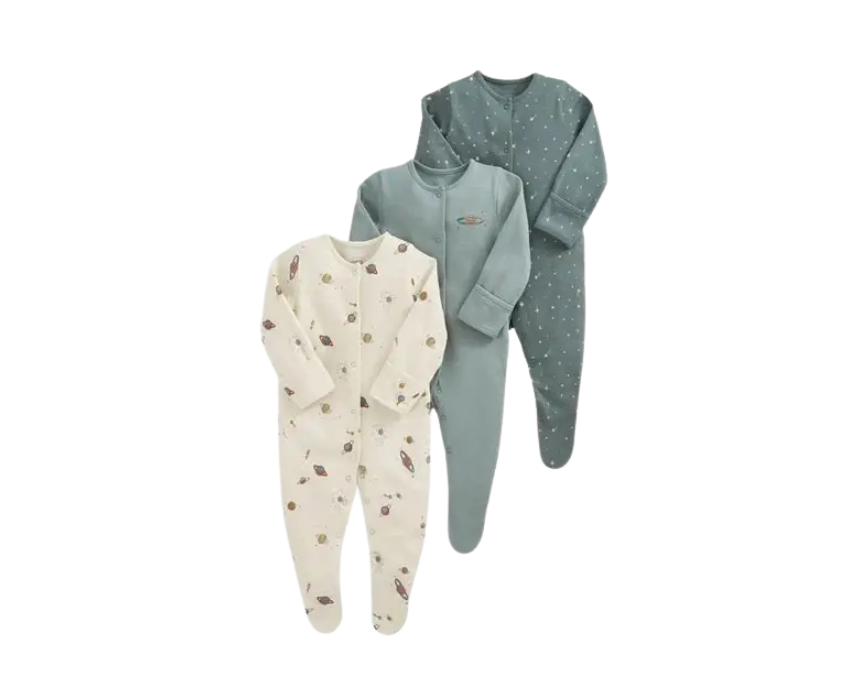 The Planets Sleepsuits Set of 3 is part of the perfect coming-home collection, designed with timeless quality to nurture newborns in their first days. This 3-pack includes long-sleeved all-in-one sleepsuits with one planet print, one star print, and one blue design with a planet logo, all finished with easy popper fastenings for quick changes. Ideal for day and night, wear alone or layer with a cardigan for cozy comfort.