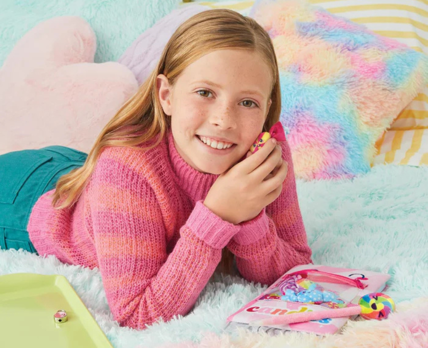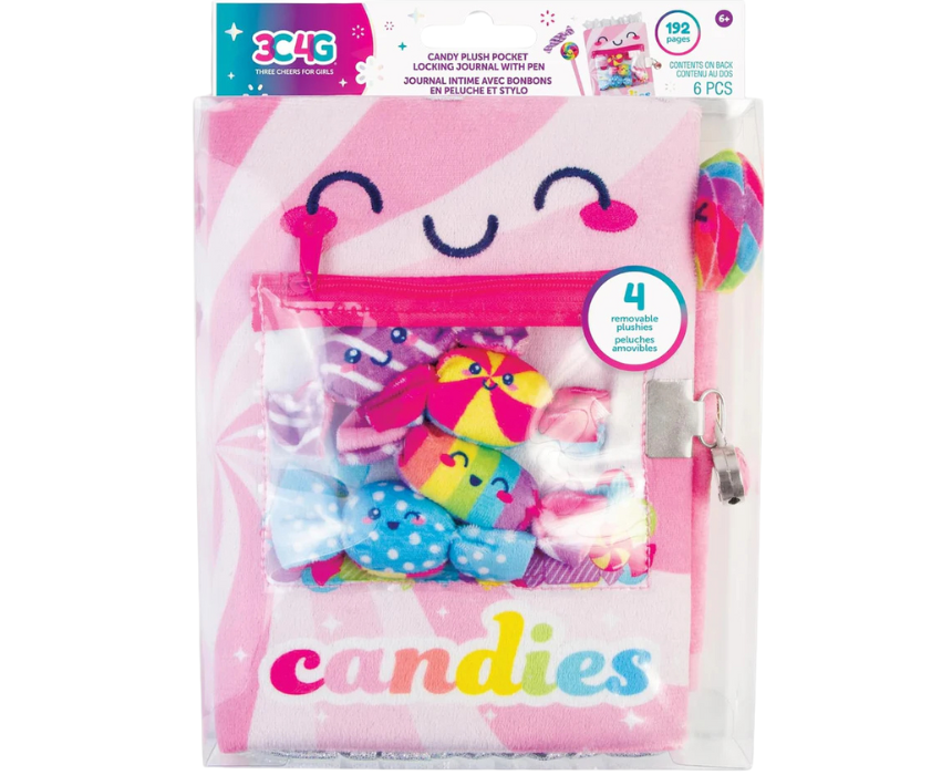 The Candy Plush Pocket Locking Journal lets tweens doodle and jot notes in bubble gum-themed style, featuring a secure lock for privacy. Removable plush pieces stored in the front pocket add extra fidget fun, and a plush pen is included for writing on the go. Perfect for birthdays, holidays, or just because, it encourages creative expression in a fun and stylish way.