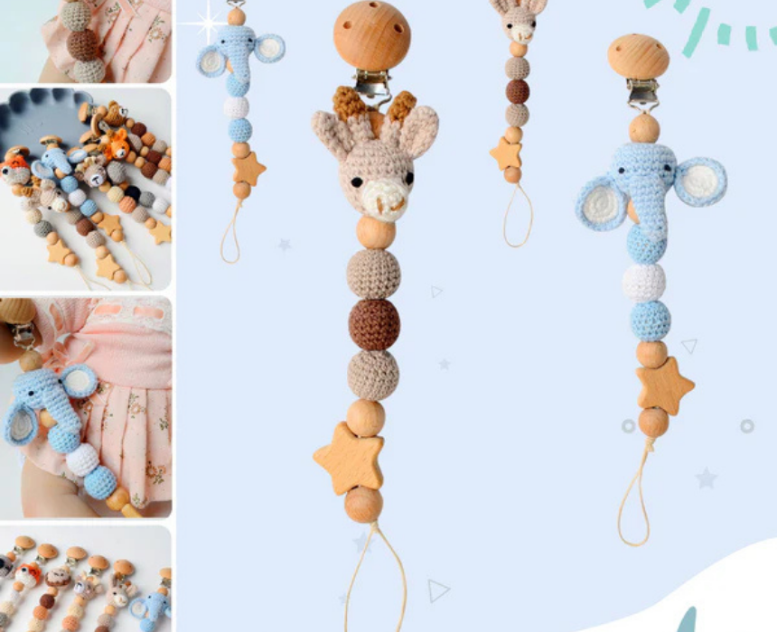 Keep your baby’s pacifier close and clean with this Animal Plush Pacifier Holder featuring a soft fabric chain and a cute elephant or giraffe head. The natural wooden clip securely attaches to clothes, bibs, or blankets, preventing the pacifier from falling while being gentle on baby’s skin. Lightweight, durable, and charming, it’s perfect for everyday use and adds a playful touch to any outfit.