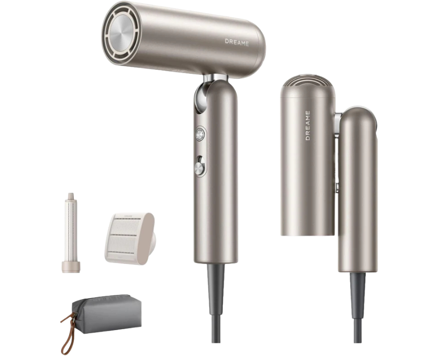 The Dreame Pocket Hair Dryer is an ultra-lightweight, compact dryer weighing just 300g and measuring 50mm, designed for effortless travel and home use. Featuring a high-speed 110,000 RPM brushless motor, it dries hair quickly in 40 seconds while 300 million negative ions reduce frizz and enhance shine. With 5 temperature modes, 2 airflow speeds, intelligent NTC temperature sensing, and two professional styling nozzles, it delivers precise, safe, and salon-quality results quietly under 60 dB.